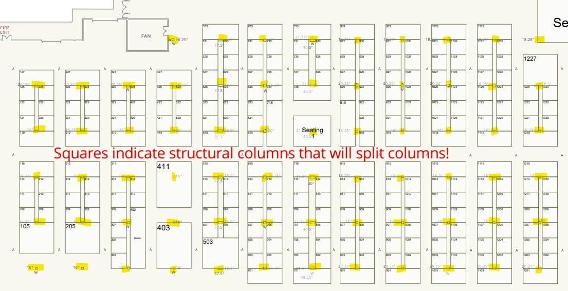 When selecting your booth(s), don’t forget to pay close attention to the small square boxes on the MapYourShow Booth Sales map – they signify the presence of columns within the exhibit halls. Please see the diagram below in which the squares are highlighted to indicate structural columns.